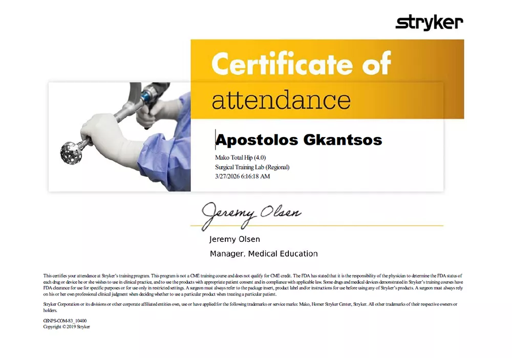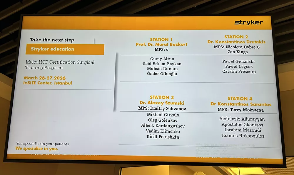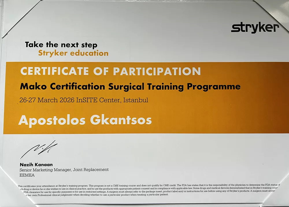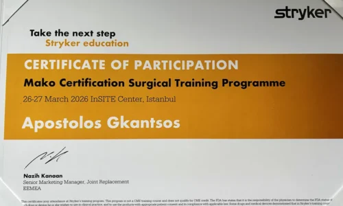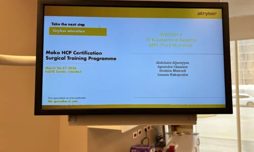 Ολοκληρώθηκε με επιτυχία η εξειδικευμένη εκπαίδευση και πιστοποίηση του Ορθοπαιδικού Χειρουργού Δρ. Απόστολου Γκάντσου στη χρήση του ρομποτικού συστήματος Mako (Stryker), που πραγματοποιήθηκε στις 26-27 Μαρτίου 2026 στο InSITE Center της Κωνσταντινούπολης.