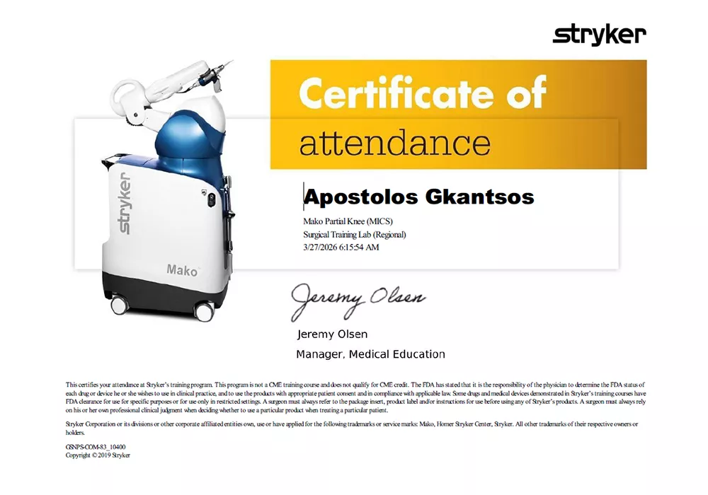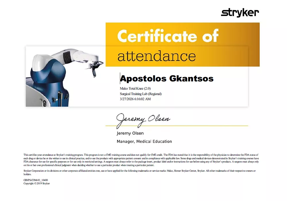 Πιστοποίηση Mako Stryker Απόστολος Γκάντσος